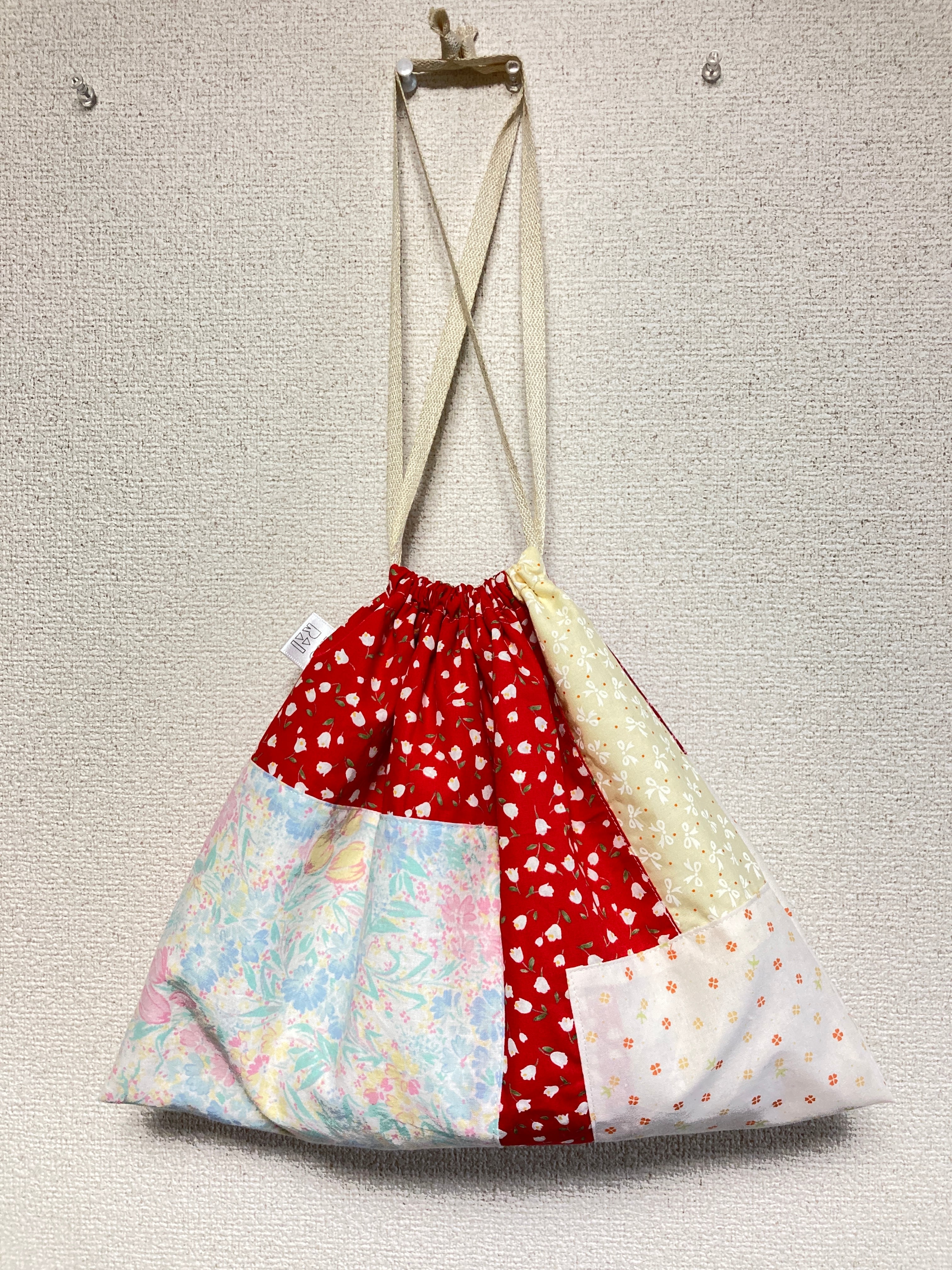 赤系色の布をたくさん使用した、プックリした見た目がポイントの巾着です。